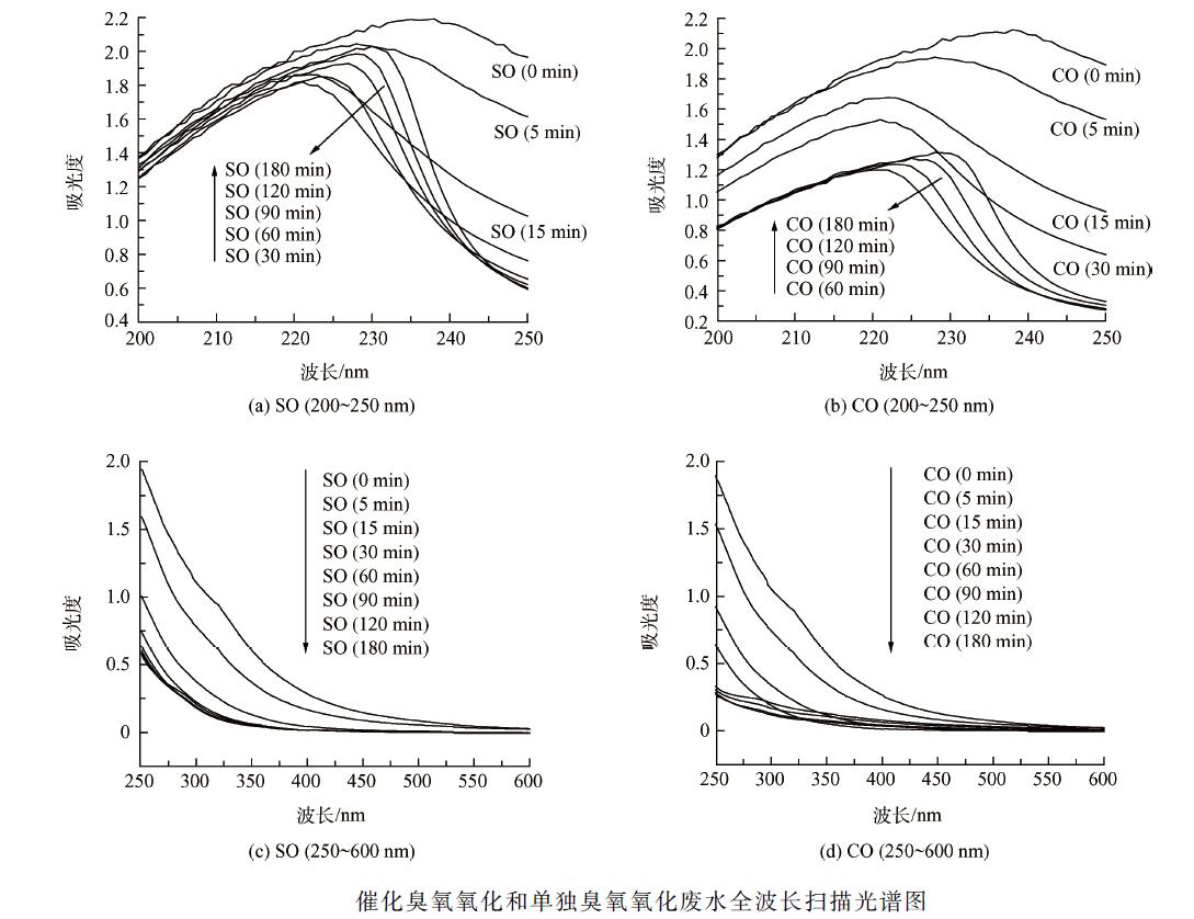 全波長掃描可以反映溶液整體對某一波長光的吸收性,適合分析含多種有機物的實際廢水。其中,紫外譜圖提供的是常見官能團信息。若溶液在220 ~ 250 nm 波段有強烈吸收,說明該溶液化合物中存在共軛雙鍵(共軛二烯烴、不飽和醛、不飽和酮),否則可能是飽和脂肪烴、脂環(huán)烴或其衍生物;化合物在250 ~290 nm 波段有強烈吸收,說明化合物分子中有苯環(huán)存在(以UV254 為代表);化合物在300 nm 以上有強烈吸收,說明分子中有較大的共軛體系(大分子腐殖質(zhì),以UV410 為代表)。廢水不調(diào)節(jié)pH 值(中性),臭氧投加量為10. 7 mg·min - 1 ,催化劑投加量為200 g·L - 1 。