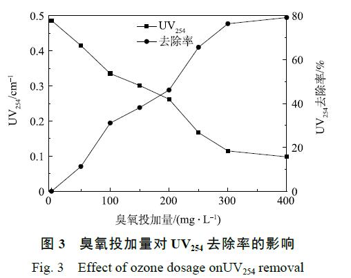 臭氧催化氧化實(shí)驗(yàn)在室溫下進(jìn)行,廢水初始 pH 為 5,反應(yīng)時(shí)間為 60 min,通過(guò)調(diào)節(jié)臭氧進(jìn)氣濃度控制臭氧的投加量,圖 2 和圖 3 為不同臭氧投加量條件下水中有機(jī)物的降解情況。由圖 2 可知,隨著臭氧投加量的增加,水中 COD 的去除率不斷升高,當(dāng)臭氧投加量增 至 400 mg·L−1 時(shí) , COD由 532 mg·L−1 降 至 246 mg·L−1, UV254 由 0.468降至 0.098,COD 和 UV254 的去除率分別升至53.7% 和 79.1%。COD 和 UV254 的去除率隨著臭氧投加量的增加而逐步升高,當(dāng)臭氧投加量增到 300 mg·L−1 時(shí),COD 和 UV254 的去除率開(kāi)始趨于平緩,臭氧的利用率開(kāi)始下降。臭氧催化氧化主要通過(guò)臭氧催化產(chǎn)生·OH,通過(guò)·OH 氧化水中有機(jī)物。隨著臭氧投加量的增加,有機(jī)物不斷被降解,隨著水中可被氧化的有機(jī)物的減少,·OH 與有機(jī)物發(fā)生碰撞的概率降低[17],從而導(dǎo)致臭氧的利用率下降。