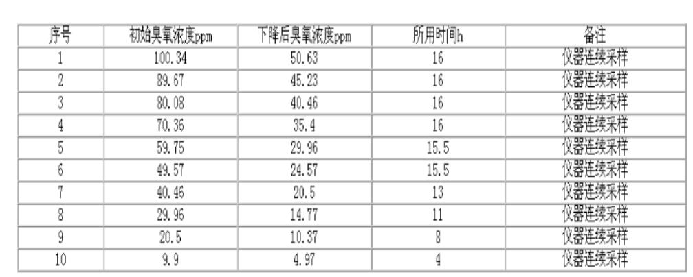 比利時臭氧專家W·J·馬舍蘭在《臭氧雨水的接觸和接觸器尾氣處理》文中認為:臭氧在霧中的半衰期約為4~5h。國內(nèi)外一些臭氧資料中的半衰期相距很大。為此,我們用一容積為0.95mg/m3的玻璃柜,在環(huán)境溫度為20~25℃;環(huán)境溫度為60~80%Rh,臭氧濃度在200ppm以下的情況下做了一些實驗,現(xiàn)將結(jié)果抄錄如下。
