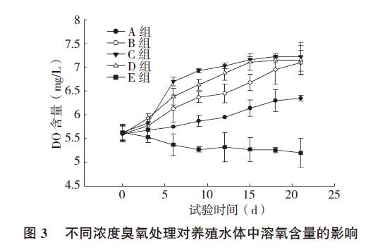 由溶氧含量結果(圖3)可知,使用臭氧處理育苗水體可以明顯提高水體中的溶氧含量,隨著臭氧濃度的增加,水體中的溶氧含量也不斷增加。D組水體溶氧含量略低于C 組,說明臭氧雖然能提高水體中的溶氧含量,但若濃度太高,則水體中的殘留就會增加,且會產生氧化性副產物,對水生生物造成毒害,影響生產養殖的順利進行。